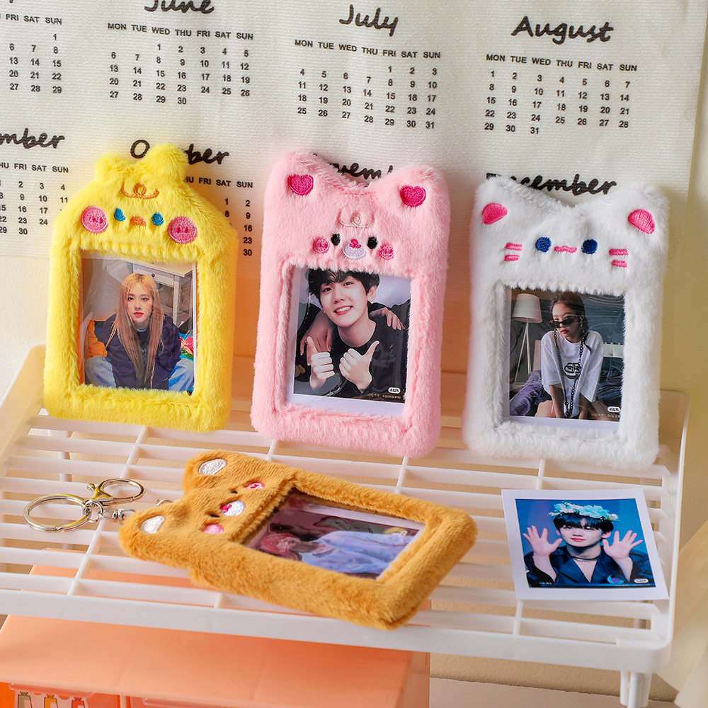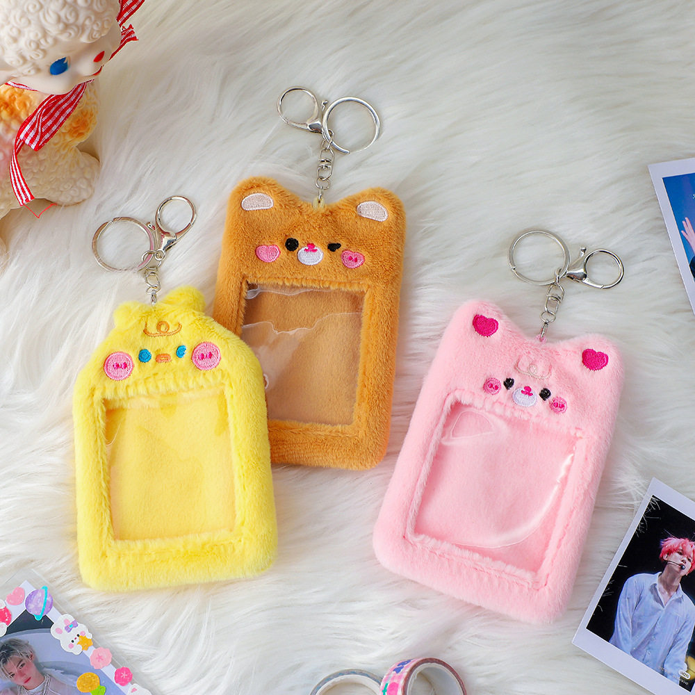 ふわふわの素材と愛らしい動物の刺繍が施されたデザインで、持ち運びにも便利なキーホルダー付きです。